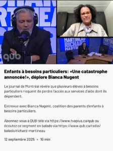 Notre porte-parole a pris position à l’émission de Richard Martineau sur le réseau QUB TVA pour dénoncer les conséquences du définancement chronique du réseau scolaire et expliquer comment le manque de vision pour l’adaptation scolaire et de leadership pour une éducation nationale digne de ce nom ont mené à la catastrophe annoncée de l’épidémie actuelle de bris de services.