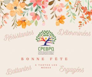 Que ce soit aujourd’hui, demain et nous l’espérons au plus fort des besoins, la Coalition de parents d’enfants à besoins particuliers du Québec vous invite à faire la démonstration de votre solidarité envers elles à tout moment et dans tous les milieux où ces mères citoyennes exigent le respect des droits humains de leurs enfants.